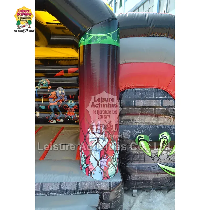 Pienet puhallettavat pomppulinnat, joissa kummittelee liukumäkiä: Tämä zombiteemalla varustettu "Haunted Combo" -kumi on suunniteltu valloittamaan lapset jännittävällä sarjakuva-kauhuestetiikallaan. Rohkea yhdistelmä rohkeita punaisia, kiiltäviä mustia ja aavemaisia ​​vihreitä ja sinisiä luo eloisan, jännittävän ympäristön. Suuret, leikkisät grafiikat sarjakuvazombeista dynaamisissa asennoissa – kuten sairaanhoitaja, aivoja syövä hahmo ja zombilapsi nallekarhuineen – ovat enemmän hauskoja kuin pelottavia. Interaktiiviset elementit, kuten katolla ryömivä suuri sininen zombie, seinien läpi murtautuva kynsikäsi ja pylväiden ketjut/grafiikka herättävät mielikuvituksellista leikkimistä. Suljettu rakenne, jossa on suojaava yläkansi, tarjoaa varjoa ja suojaa kevyeltä sateelta, kun taas koteloitu liukumäki lisää seikkailua. 10 jalan korkeus tekee siitä monipuolisen sekä sisä- että ulkokäyttöön, ja se sopii täydellisesti Halloween-juhliin, syksyn festivaaleihin, teemallisiin syntymäpäivätapahtumiin ja pelottavaan takapihalle.